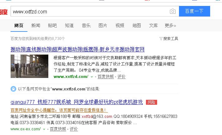 第二條信息,下面的地址,郵箱啊等等資料都是我們新鄉(xiāng)市天豐振動(dòng)機(jī)械公司的,但是打開內(nèi)容,卻是一個(gè)很不的網(wǎng)站,我查看了一下源代碼,沒有我們公司的,這是什么情況呢,然后我又看百度快照信息,結(jié)果如下: